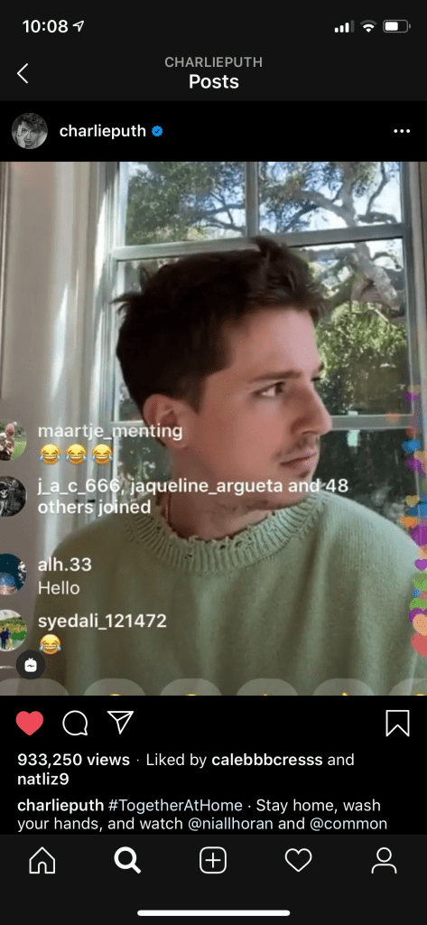The Corona Virus is something that needs to be taken seriously by people internationally, which includes people quarantining themselves in their homes and minimizing social interaction and contact with others. Because of this, many musicians banded together to encourage self-quarantining, and decided to do a series of concerts from their own homes, live-streamed on Instagram. Not only is this about bringing people together through music, it was about encouraging and promoting the idea of social distancing, and working together to slow the effects and lower the number of victims of the virus. Many artists have been apart of this and have live-streamed this past week, including Charlie Puth, Niall Horan, Chris Martin, Common, John Legend and more.